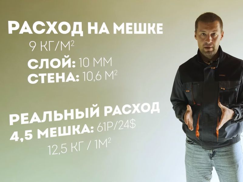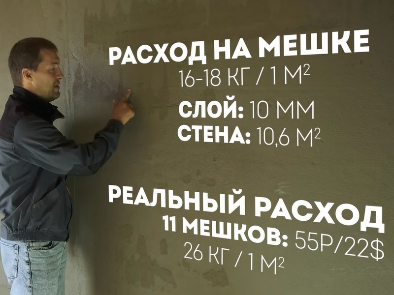 Итак, «паспортный» расход готовой смеси на метр квадратный у цементной штукатурки — 16−18 кг при слое в 1 см. Реальный расход при толщине слоя чуть больше 1 см получился больше — 26 кг/м². Для стены площадью 10,6 м² понадобилось 11 мешков общей стоимостью 55 рублей.