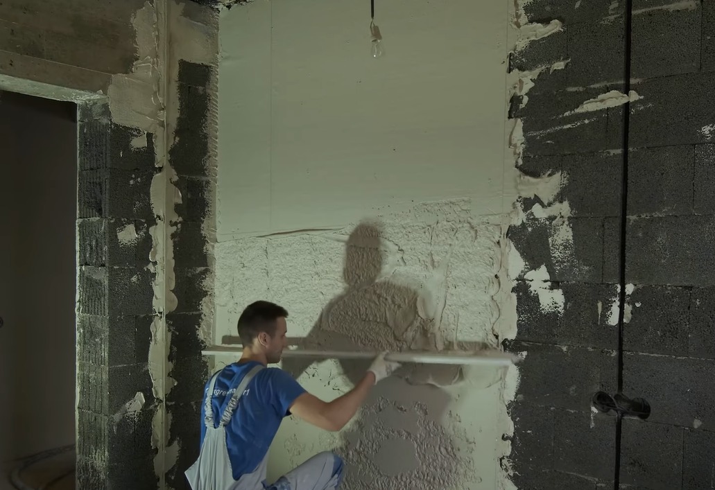 Полигоном для эксперимента стал строящийся дом Алексея. Главный вопрос, на который нужно было ответить — какую штукатурку выгоднее использовать. Исходные данные были одинаковые — две стены из керамзитобетонных блоков одинаковой площади (10,6 м²). Первую покрыли цементной штукатуркой, вторую — гипсовой. Наносили штукатурки машинным методом, по маякам, в одно и то же время, примерно одинаковым слоем.