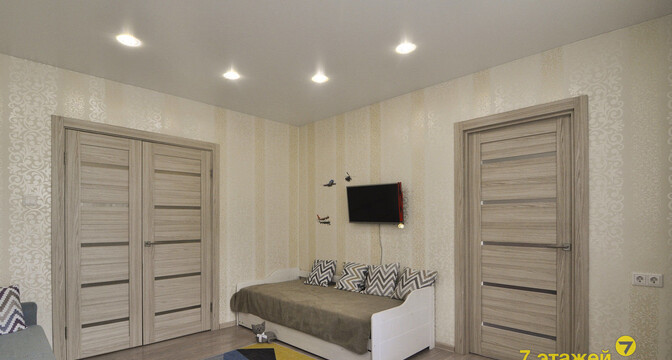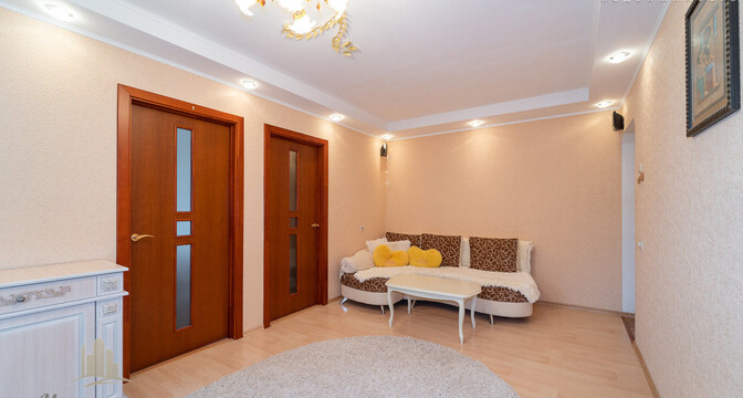 Здесь выполнен качественный ремонт — в жилых комнатах полы из ламината, в коридоре и кухне — плитка, полы теплые, все стены выровнены, подвесные потолки с точечным и общим светом, заменена вся электропроводка.