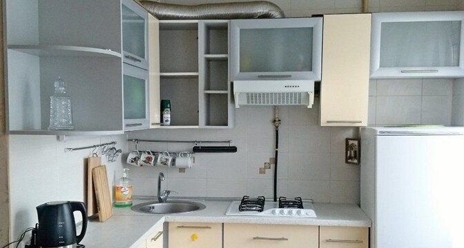 Как пишут в объявлении, в квартире выполнен аккуратный ремонт. Есть встроенная кухня, укомплектованная необходимой бытовой техникой — плита с духовым шкафом, СВЧ-печь, напольное покрытие — ламинат и плитка. На всех окнах установлены качественные стеклопакеты. Окна выходят во двор. Установлены металлическая двойная дверь, счетчики воды, газа и электроэнергии. Есть сухой и удобный подвал.