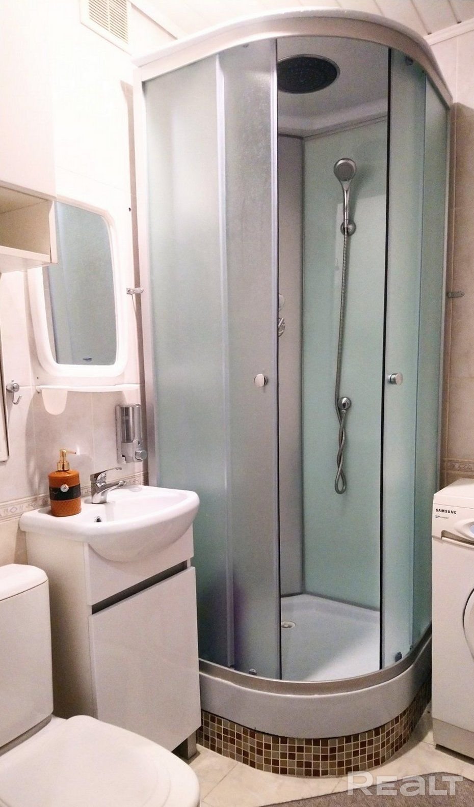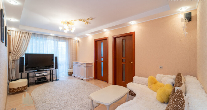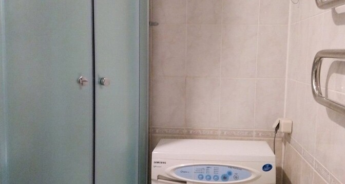 В квартире хороший ремонт — полы из ламината, двери из массива, установлены стеклопакеты и входная металлическая дверь. Также здесь новая душевая кабина, есть два встроенных шкафа, холодильник, телевизор, стиральная машина. Все при продаже остается новом владельцу. Есть застекленный балкон. Санузел совмещенный.