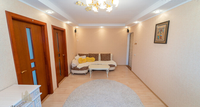 Одно из преимуществ квартиры в высоких потолках — почти три метра. В квартире два застекленных балкона обиты вагонкой, санузел раздельный, во всех комнатах уложен ламинат, выровнены стены и заменены трубы на полипропиленовые, установлены двухкамерные стеклопакеты. В ванной новый смеситель и полотенцесушитель, в туалете новый унитаз.