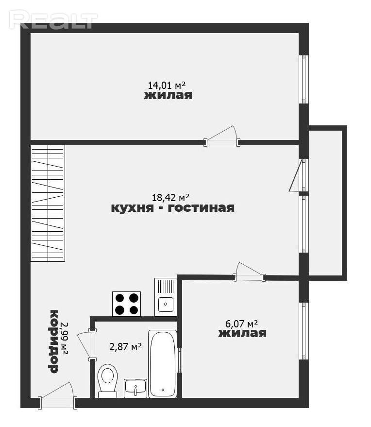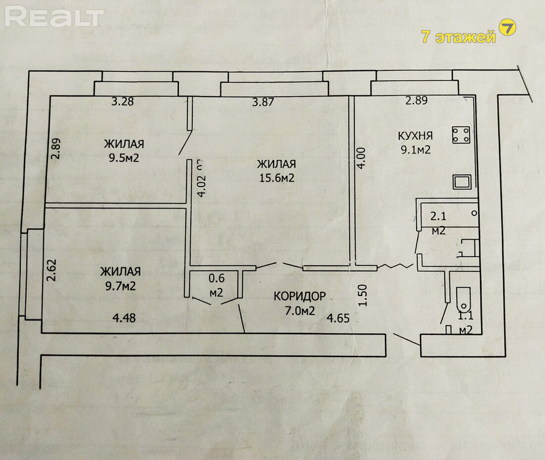 В объявлении отмечается, что при продаже на кухне остается кухонный гарнитур с техникой и встроенная мебель в спальне и коридоре.