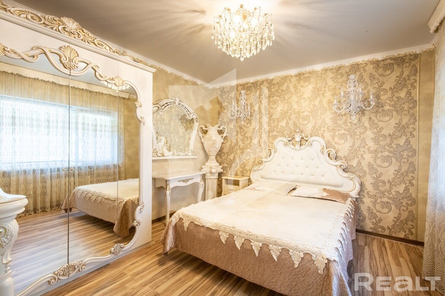 В Минске на улице Гало, 149 продается дом площадью 64 квадратных метров с участком 6 соток. Не первый взгляд, ничего необычного, но ремонт в внутри дома удивляет — дорогая мебель, коринфские колонны, витиеватые узоры и канделябры. Пожалуй, так выглядит современный венецианский барокко. На объявление обратил внимание Telegram-канал «Будни риэлтора. Минск».