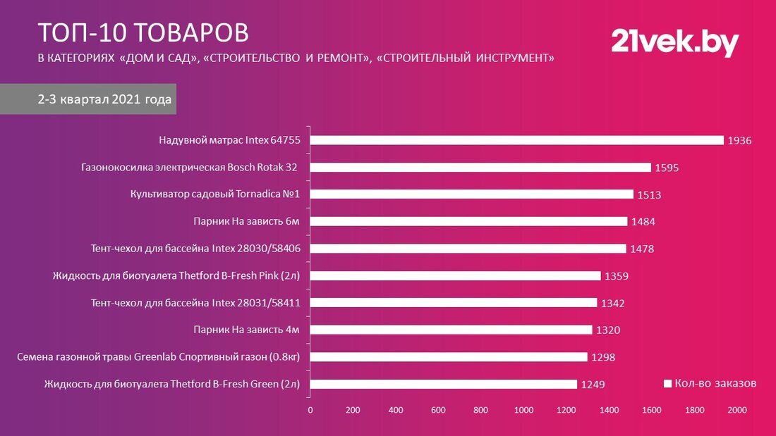 С апреля по сентябрь 2021 года 21vek.by доставил 419 960 заказов в категориях «дом и сад», «строительство и ремонт», а также «строительный инструмент». Это на 62% больше, чем в аналогичный период прошлого года. Самым популярным товаром по количеству заказов за сезон стал надувной матрас Intex 64 755, потеснивший электрическую газонокосилку Bosch Rotak 32, которая удерживала первенство в сезоне 2020.