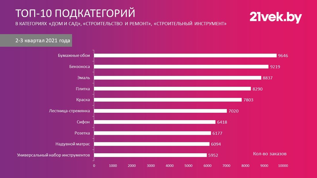 В топе подкатегорий по количеству заказов на первом месте бумажные обои, за ними бензокоса, эмаль, плитка, краска, лестница-стремянка, сифон, розетка, надувной матрас, универсальный набор инструментов.