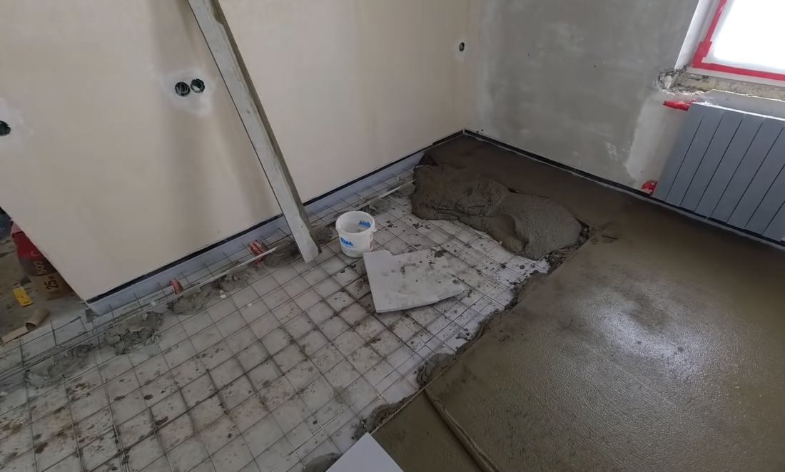 Чтобы получить идеально ровную поверхность Павел рекомендует сделать дополнительный тонкий слой наливного пола или, как его еще называют, нивелира. Он крепче плиточного клея, а при тонкослойной заливке расход материалов будет минимальным