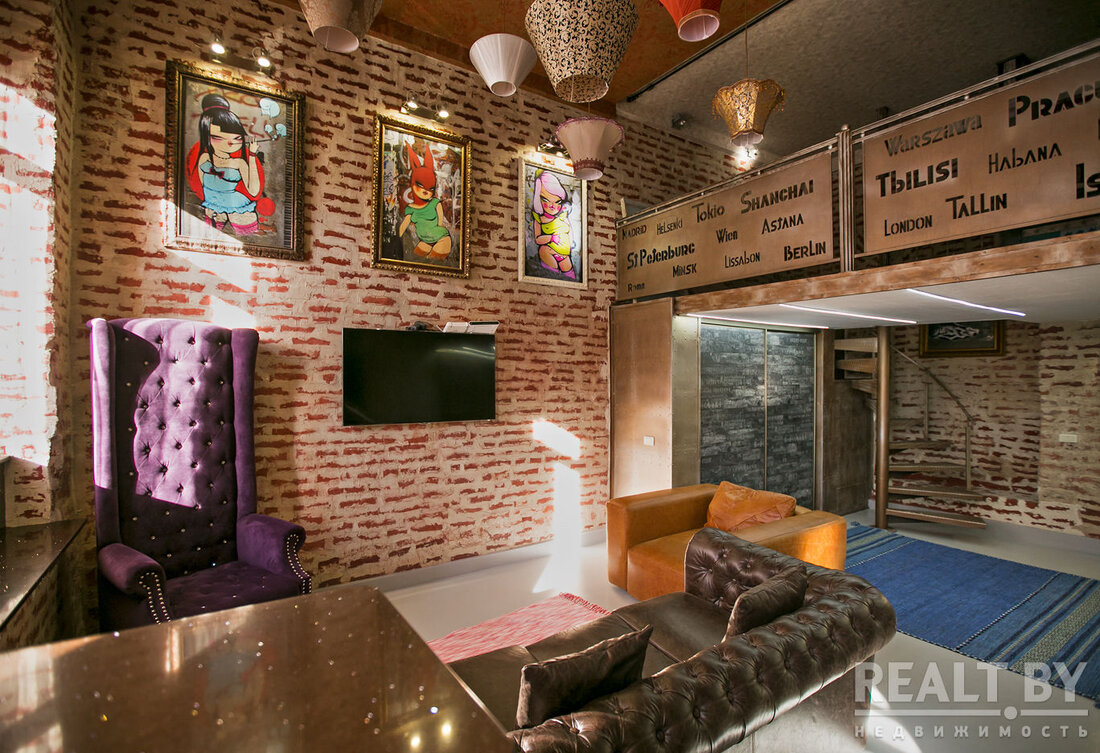 Граффити на кухне, настольные светильники на потолке и вольтеровское кресло. В Минске сдается на сутки очень необычная двухуровневая квартира