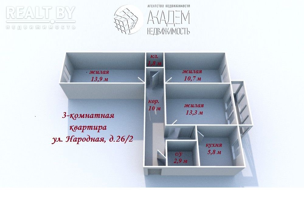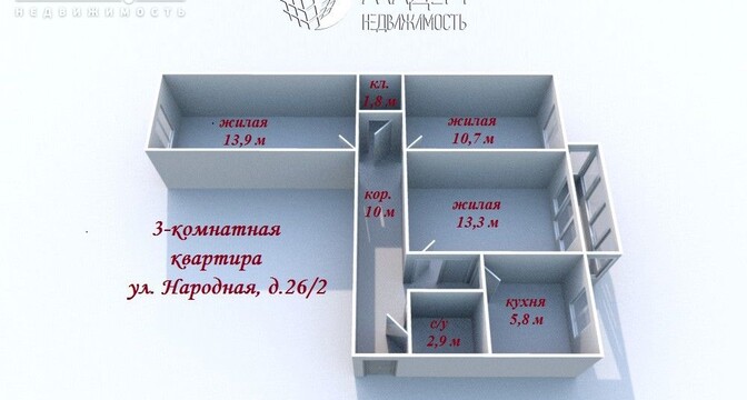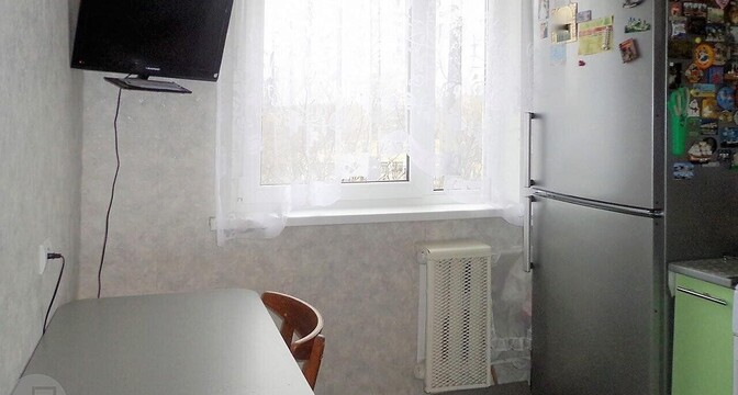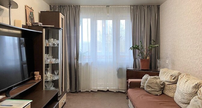 Трешка продается в доме на улице Народная, 26/2. Площадь составляет 58,5 квадратных метров (жилая — 38, кухня — 6). Располагается на пятом этаже пятиэтажного панельного дома, построенного в 1964 году.