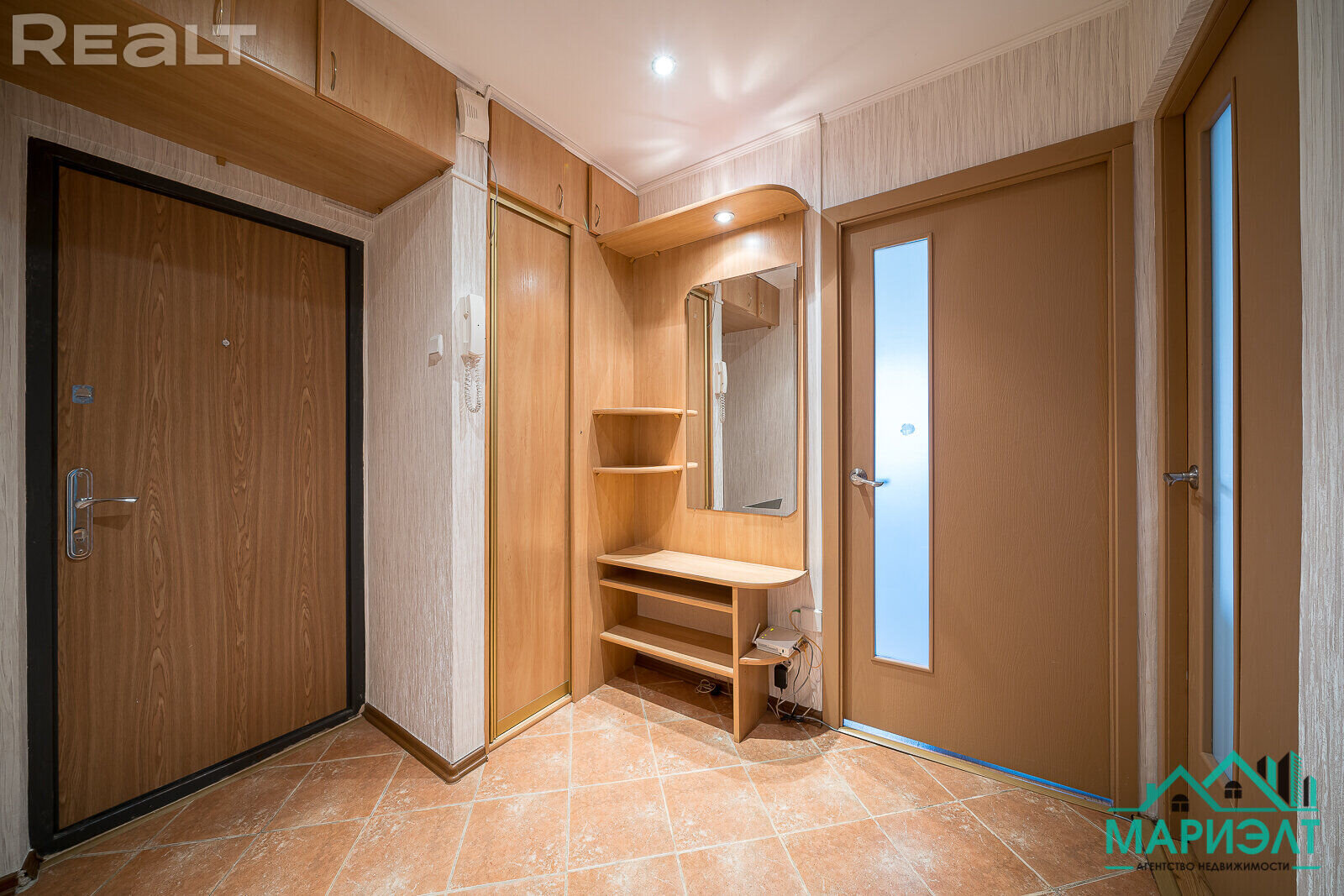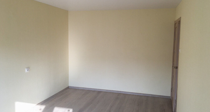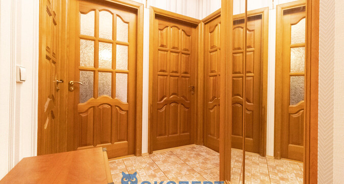 Межкомнатные двери из массива сосны. Напольное покрытие — ламинат, в кухне — линолеум. Балкон застеклен. Проведено оптоволокно. Есть два встроенных шкафа. Санузел совмещенный.