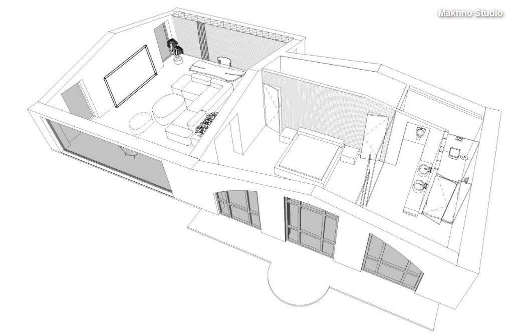 Дом, в котором находятся апартаменты, со всех сторон окружен природой. Это стало отправной точкой для создания интерьера. Поэтому главный элемент тут − шестиметровое окно во всю стену, из которого открывается вид на реку. На соседней стене расположен телевизор и два дополнительных окна во весь рост с видом на лес.