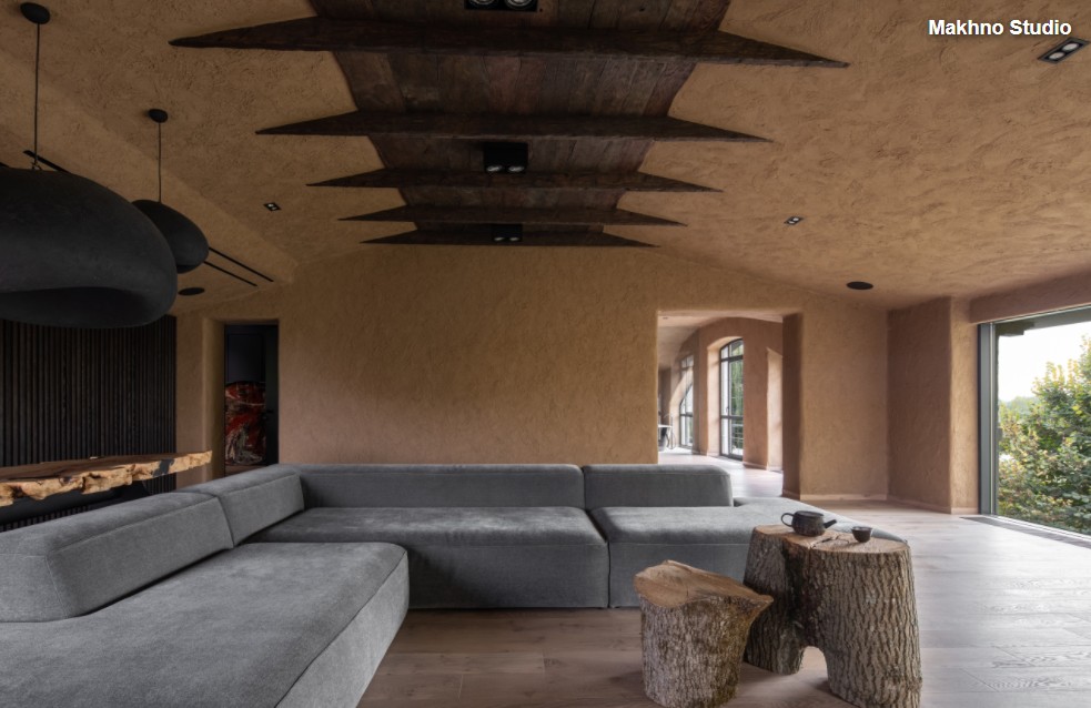 Следуя старой украинской традиции, стены и потолок покрыли глиной. «Это современная интерпретация техники, которую использовали наши деды-прадеды в хатах-мазанках. В ее основе − глина, замешанная с соломой, чаем, льняными семечками. Этот замес слой за слоем наносился на стену — „мазался“ − пока не получился нужный нам рельеф. Самое интересное происходило, когда материал начинал высыхать и трескаться в тех местах, где ему хочется, создавая неповторимые узоры», − вспоминает Сергей Махно