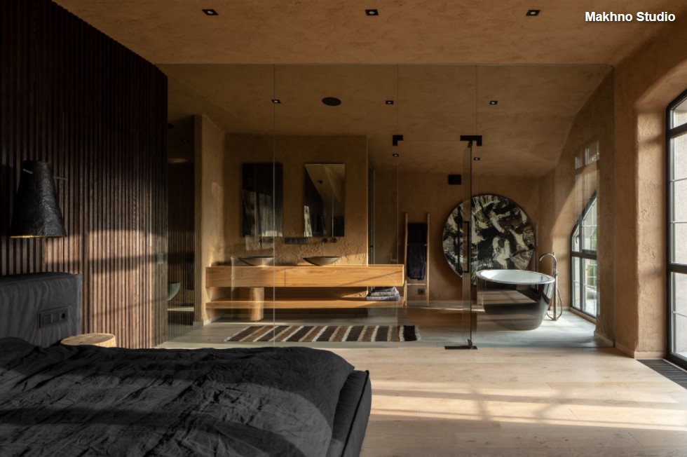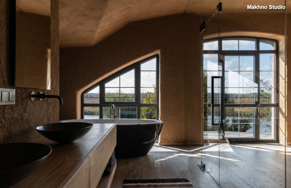 Стены в ванной комнате, как и везде, отделали глиной. Большое керамическое блюдо, украшающее стену, расписала художница Ксения Бурыка из команды Сергея Махно. Выбором, заказом, поставками материалов и мебели, в том числе для ванной комнаты, занимался отдел комплектации Makhno Contact. Тумбу под раковину заказали у местного подрядчика.