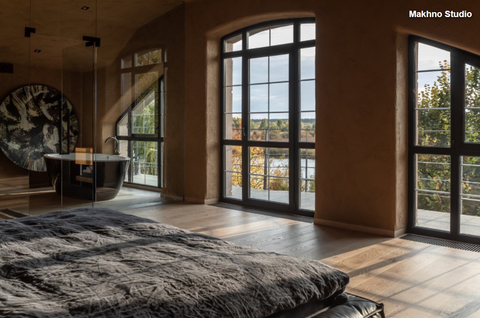 Ванная находится в едином со спальней пространстве за стеклом: «Мы не хотели отделять ванную комнату от общего помещения, поэтому остановились на стеклянных дверях, которые наполнили пространство воздухом».
