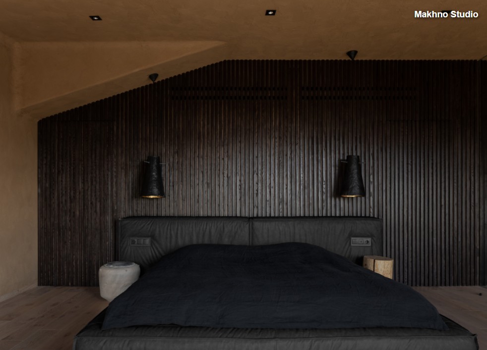 Акцентную стену выполнили из тонированного дуба. За ней находится гардеробная, в которую ведут две невидимые двери. Изголовье и кровать обшили тканью. Для удобства розетки разместили на изголовье.