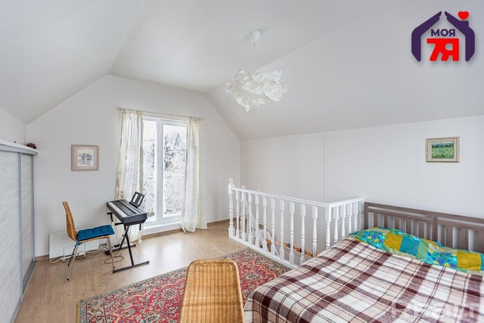Дом деревянный, обшит вагонкой в стиле фахверк. Кровля - металлочерепица, окна - ПВХ с декоративными ставнями. Мансардный этаж жилой. Общая площадь — 160 м2, участок 10 соток.