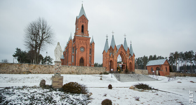 Посмотрев «белый» костел, отправились к «красному». Он совсем другой: построен в начале 20 века, расположен на окраине, его стиль — неоготика, для которой характерны четкие линии и высокие шпили.