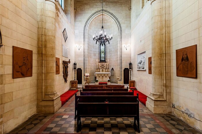Внутри замка − 22 спальни, восемь ванных комнат, винный погреб, художественная мастерская, библиотека и небольшая часовня, украшенная фресками живописца Джузеппе Скьюти. Что касается других произведений искусства, здесь можно найти картины Пола Пенниси и скульптуру Джузеппе Принци, итальянского мастера, работавшего в конце XIX века. Мраморные лестницы, колонны и мозаичные полы органично дополнили величественное убранство поместья. Интерьеры сохранили атмосферу ушедшей эпохи, однако при желании стиль комнат легко можно осовременить.