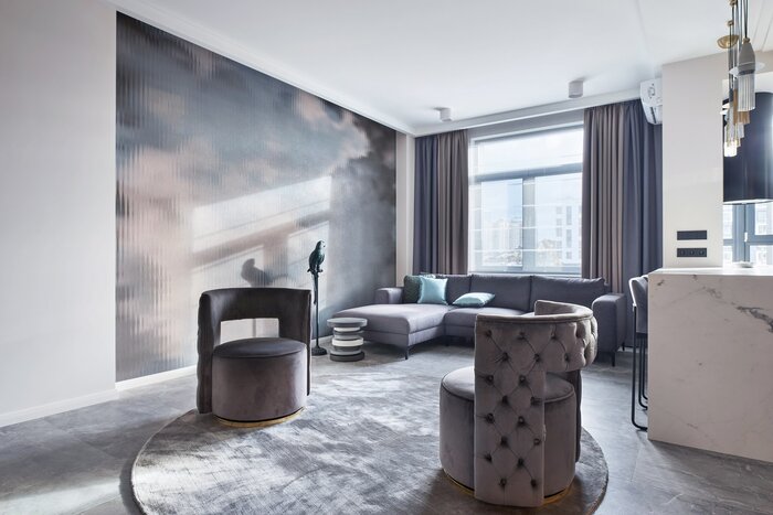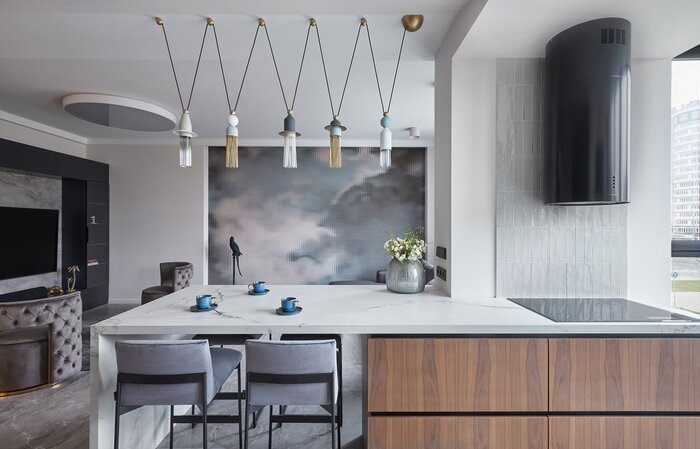 На акцентной стене в гостиной — итальянские обои, имитирующие небо за рифленым стеклом. А их серо-голубые оттенки поддерживает необычная люстра, размещенная над кухонным островом.