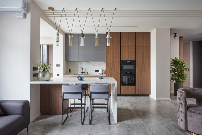 Основное место в квартире занимает кухня-гостиная. Условно эти две зоны разделены кухонным островом, однако визуально представляют собой одно большое пространство, объединенное общей идеей и концепцией.