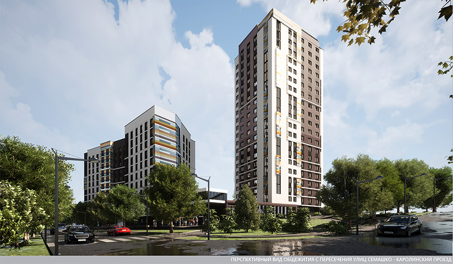 Почему строение состоит из нескольких корпусов? Такая конфигурация здания обусловлена сложной градостроительной ситуацией. При проектировании нужно было сохранить инсоляцию (освещенность помещений солнцем) двух соседних существующих общежитий и обеспечить этот же норматив для нового объекта.