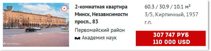 По данным отдела аналитики агентства недвижимости «Твоя столица», цены на квартиры вторичного рынка в Минске уже больше года находятся на стабильном уровне — порядка 1 150 USD/кв.м. для квартир стандартных потребительских качеств (требующих проведения, как минимум, косметического ремонта), и 1 400 USD/кв.м. для готовых к проживанию квартир с современным ремонтом и мебелью. Специалисты отмечают лишь небольшие колебания в цене, в зависимости от того, сколько в тот или иной месяц было продано квартир с хорошим ремонтом.