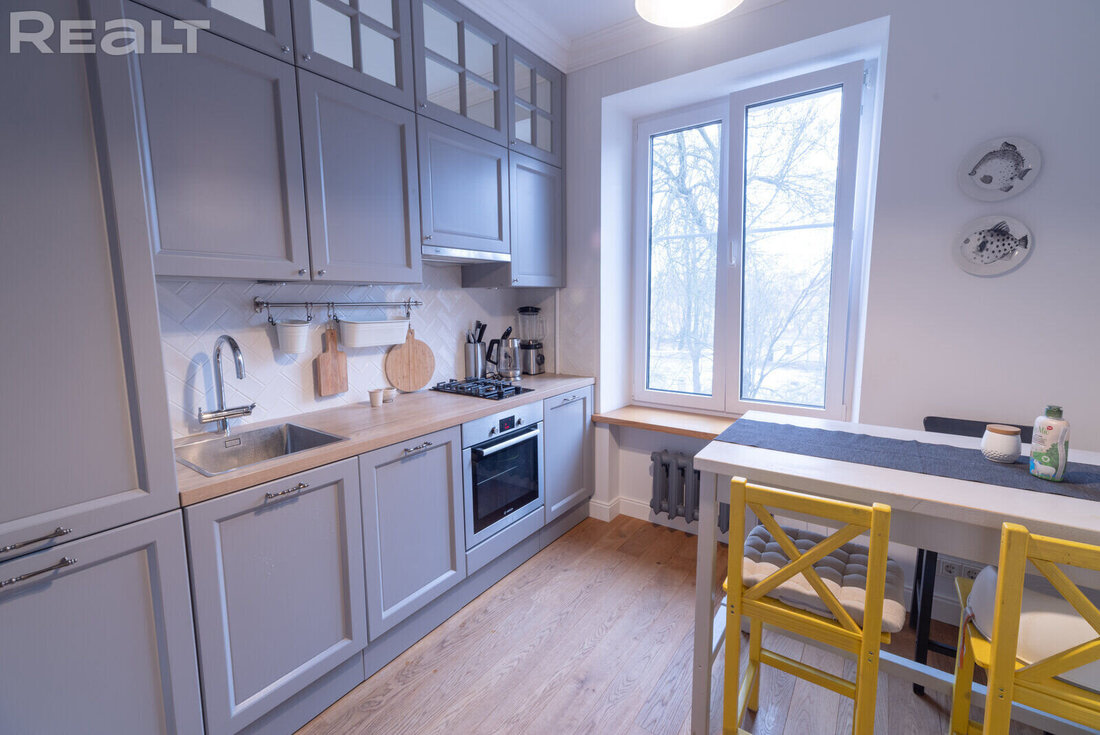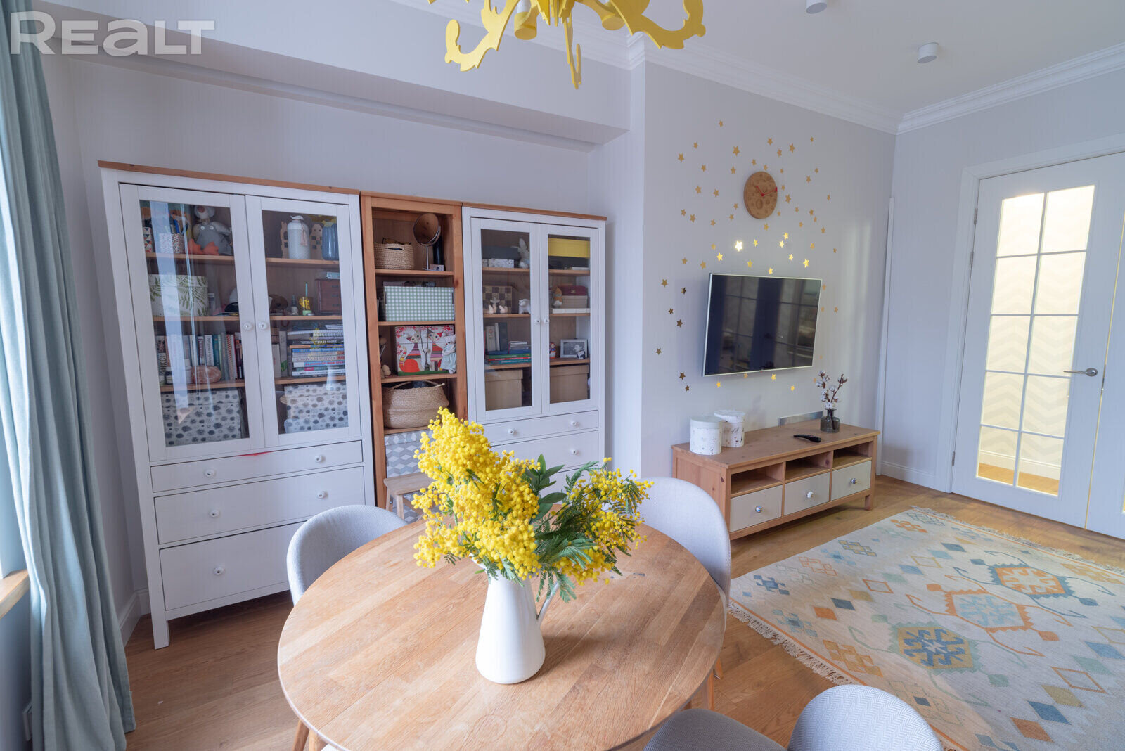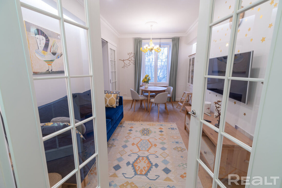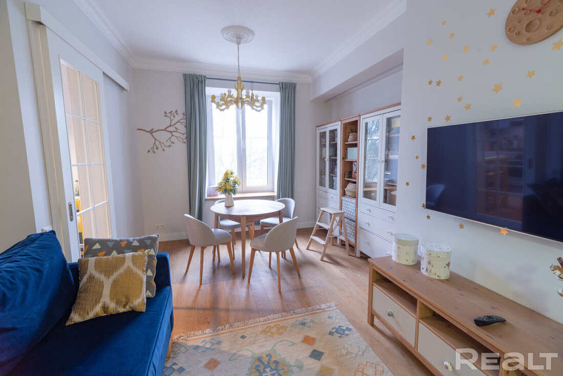 Эта квартира располагается по адресу Казарменный переулок, 5А. Рядом протекает Свислочь и возвышается стадион «Динамо». В двушке сделан хороший ремонт в скандинавском стиле. К тому же, буквально вчера эта квартира подешевела на 5 тысяч долларов. Сколько стоит уютная и домашняя сталинка?