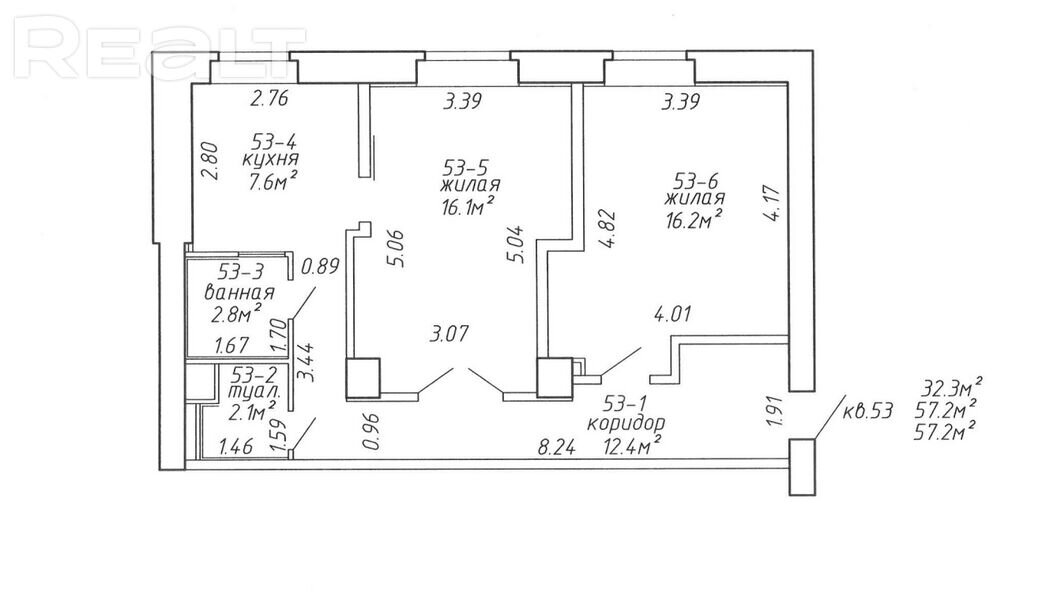 Квартира находится на четвертом этаже пятиэтажки. Общая площадь квартиры — 57,2 м², из них 7,6 м² приходится на кухню.