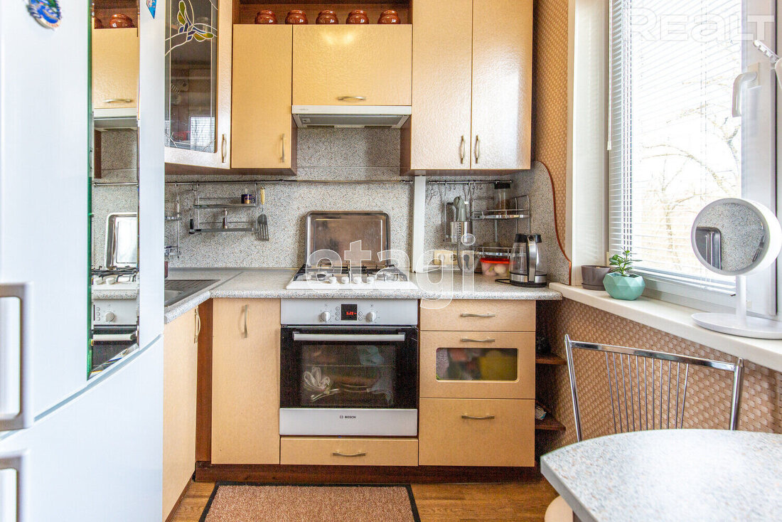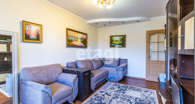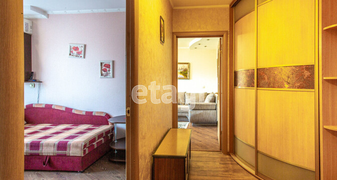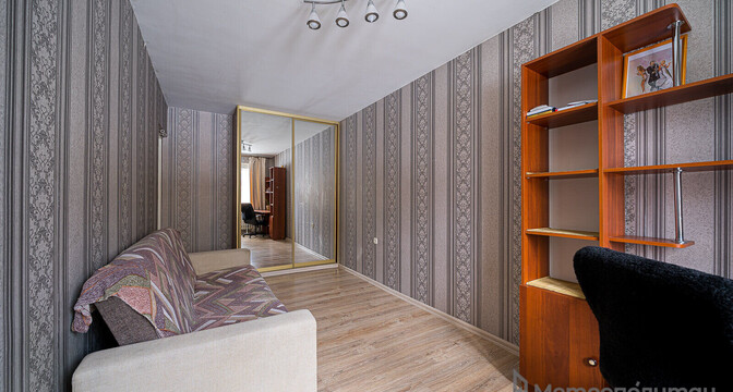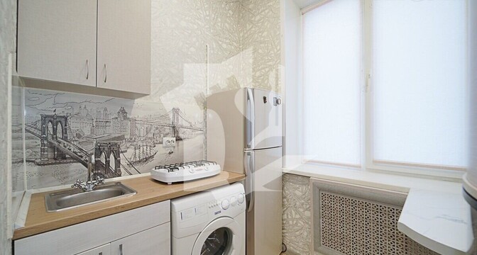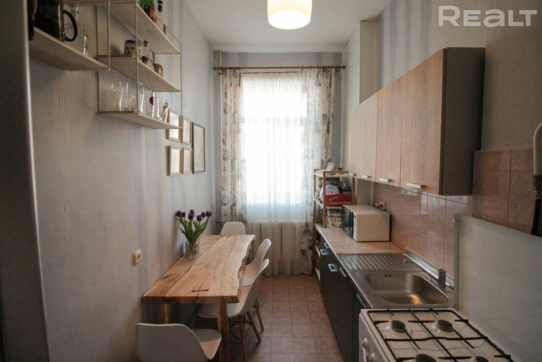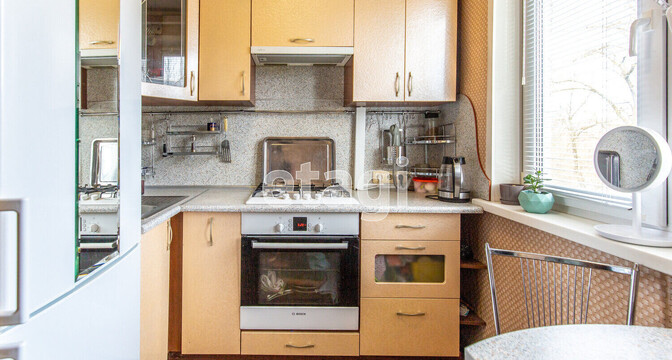 Сталинка с высокими потолками занимает 48,4 м². Вытянутая кухня — 8 метров квадратных. В окнах стоят двухкамерные стеклопакеты. В санузле и ванной комнате был сделан свежий ремонт. Владельцы оставляют покупателю мебель и бытовую технику.