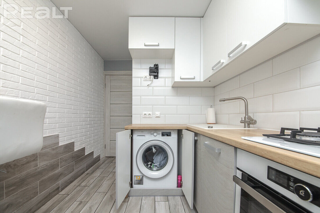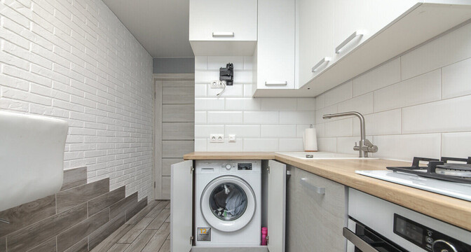 На кухне в 8 квадратных метров был сделан современный ремонт. Там есть вся необходимая бытовая техника: встроенная посудомоечная машина Whirpool, духовой шкаф, встроенная стиральная машина, система фильтрации воды, холодильник.