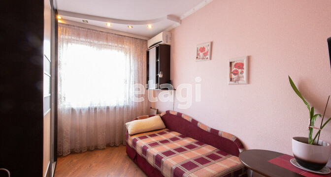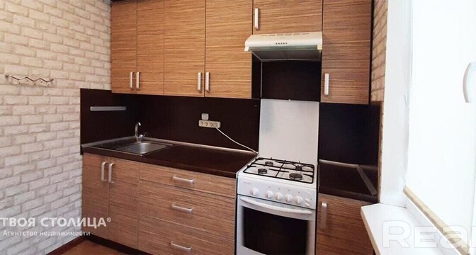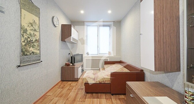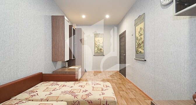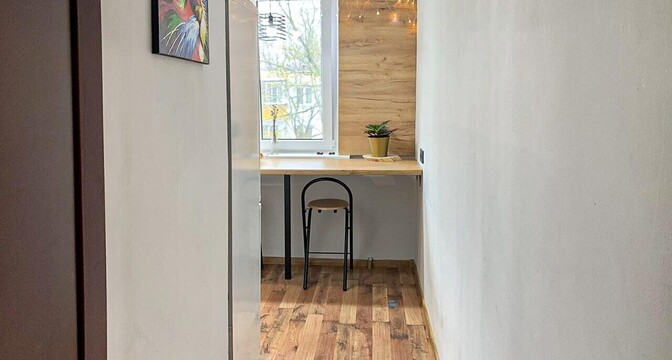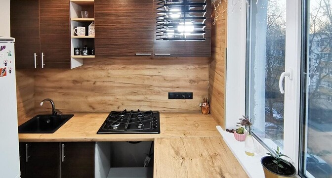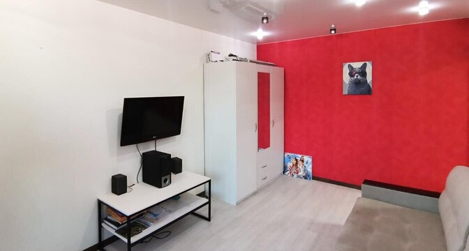 Эта квартира тоже готова к проживанию. Владельцы поставили стеклопакеты, есть встроенная кухня с варочной панелью, имеется шкаф в комнате. На полу лежит ламинат, а потолок - натяжной.