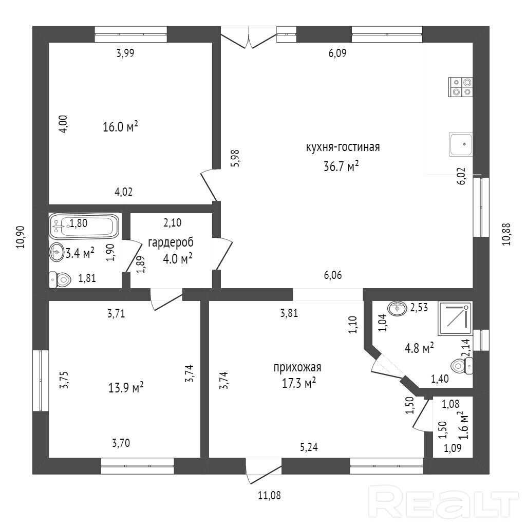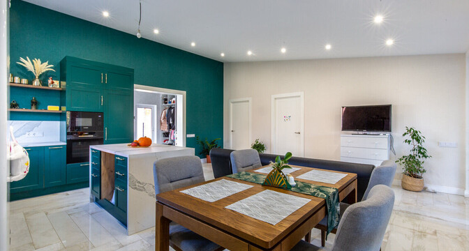 Дом построен на участке в 15 соток. Его общая площадь — 121 м². Судя по планировке в доме обустроены 2 жилые комнаты: детская и спальня. Кухня же совмещена с гостиной. Площадь всего помещения составляет 36,7 м². Цвет кухни полностью сливается с цветом стен, тем самым не нагружая пространство и интерьер деталями и красками.