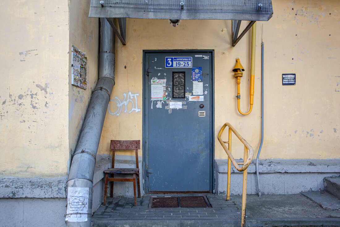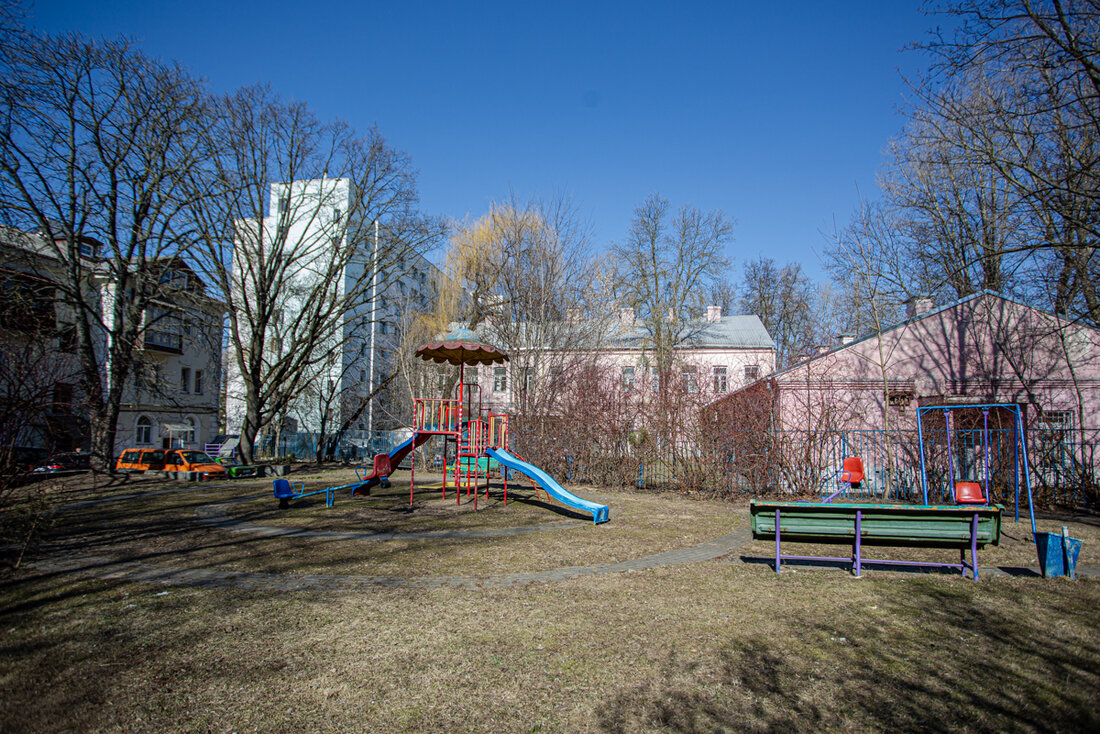 Во дворе дома на Коммунистической, 46 в обед буднего дня спокойно и немноголюдно. Но причина не в соседстве с посольствами, а скорее в расположении дома — находится старая малоэтажка в тихой Сторожевке, рядом с Осмоловкой.