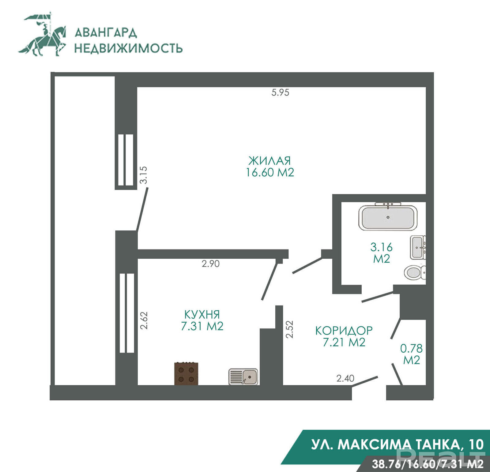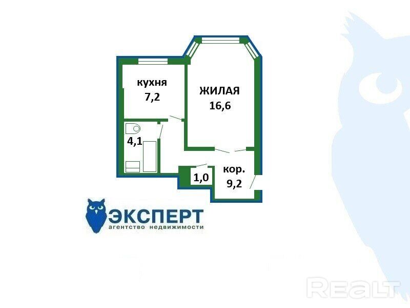 Площадь квартиры — 38 квадратных метров. Площадь кухни — 7,2 метра. Санузел — совмещенный, балкона нет.