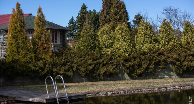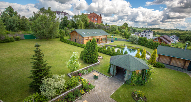 Также на участке построены баня и сарай с погребом, благоустроены беседка и бассейн. Есть аккуратно подстриженные деревья, декоративные кустарники, площадки для клумб, проложены дорожки — в общем, летом здесь будет максимально зелено и уютно. Ночью дом освещается фонарями. Хватает места и для новых замыслов: ничто не помешает сделать зимний сад, установить садовый фонтан или разбить грядки. Здесь можно устраивать вечеринки на открытом воздухе, проводить торжества и семейные праздники.