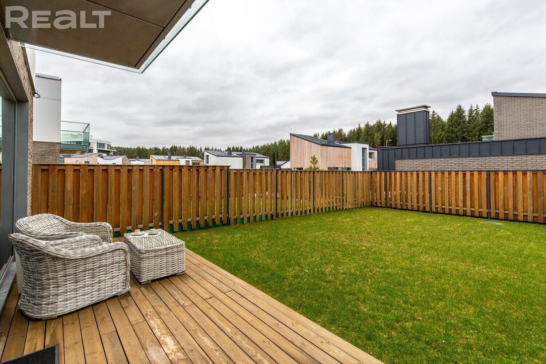 Интересующий нас объект находится на улице, застроенной таунхаусами. Это двухуровневая квартира в блокированном доме с отдельным входом, небольшим участком земли (4 сотки) и парковкой. Общая площадь жилья — 139,7 м2.