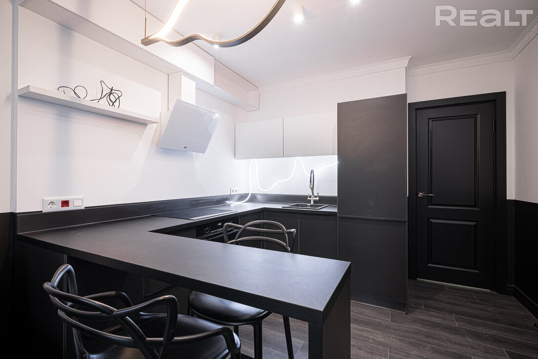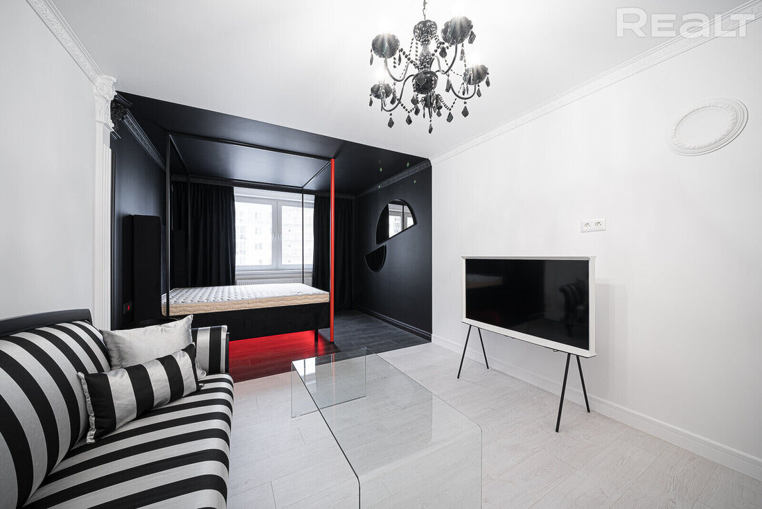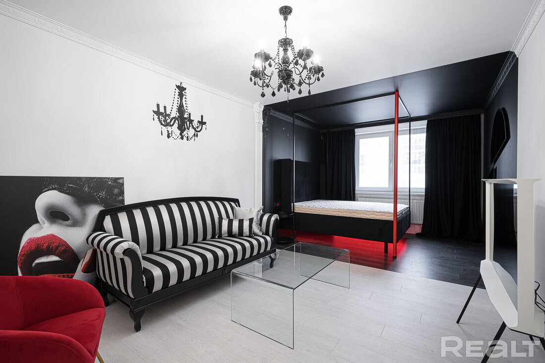 Эта квартира находится в новостройке на Богдановича. Хоть владельцы делали ремонт специально для съемки фильма московской киностудии, объект бы точно впечатлил команду «Круэллы». В интерьере используется триада основных цветов: белый, красный, черный. Оцените дизайн квартиры и ее стоимость.