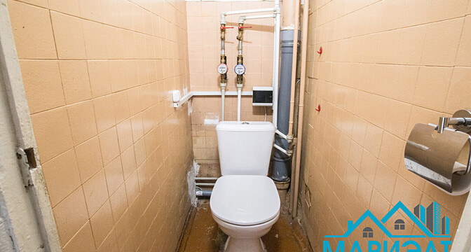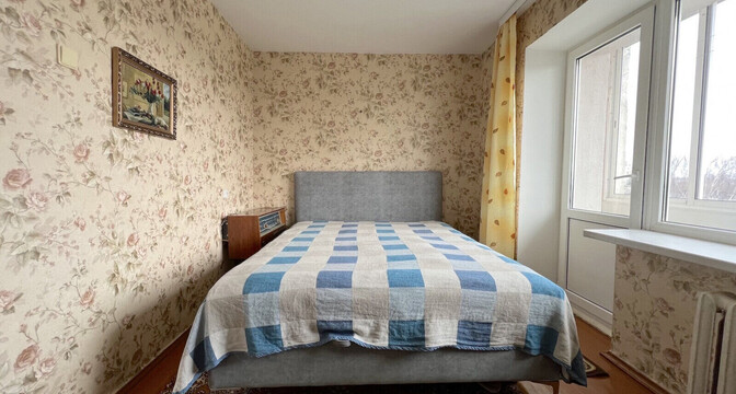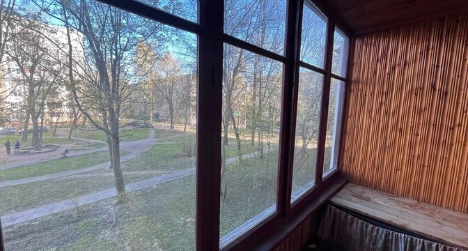 Здесь есть застекленный балкон и раздельный санузел. На окнах установлены стеклопакеты, на полу в комнатах лежат деревянные доски.