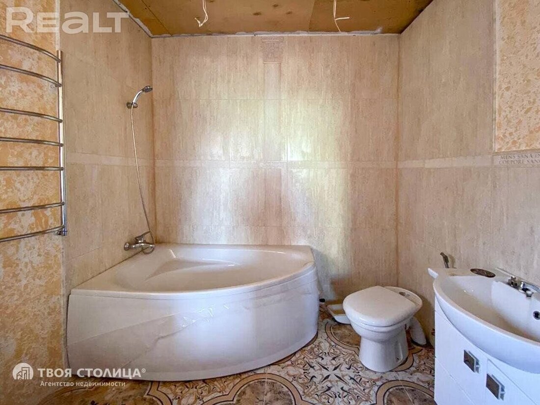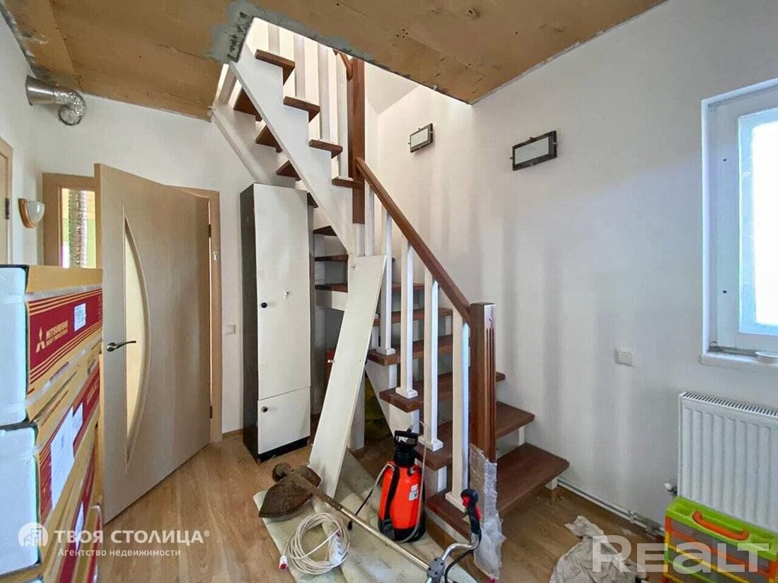 Общая площадь 115,7 м2. Первый уровень подготовлен к чистовым работам. Второй уровень готов для проживания, стены выровнены и окрашены, на полу ламинат. Санузел облицован плиткой.