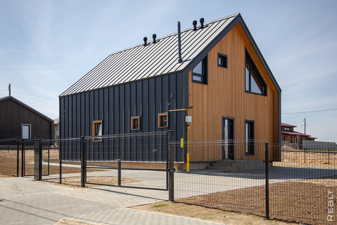 Всего в плане восемь типов домов. Есть двухэтажные барнхаусы со скатной крышей из керамзитобетонных блоков с перекрытием из сборных железобетонных плит и окнами в пол. На первом этаже — гостиная с выходом на террасу, блок технических помещений, жилая комната. На втором — три жилые комнаты, гардеробная и дополнительный санузел. Высота этажа около трех метров. Или еще вариант — коттедж на 160 «квадратов» с односкатной крышей в скандинавском стиле. Широкие оконные проемы и окна в пол. На первом этаже те же комнаты, что и в барнхаусе, а на втором располагаются две жилые комнаты, гардеробная и дополнительный санузел. В таунхаусах на две семьи предусмотрены индивидуальные места для автомобилей и крытая терраса.