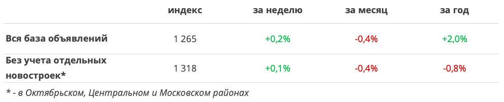 Все представленные ниже данные рассчитаны на основе всей базы объявлений (с учетом объявлений о продаже квартир в отдельных новостройках в Октябрьском, Центральном и Московском районах).