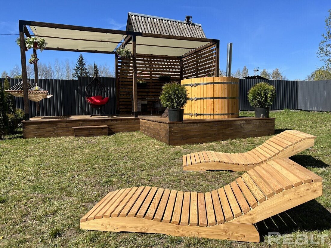 Большая работа проделана на участке в 9 соток. Здесь владельцы построили баню в стиле дома с террасой, поставили бассейн и рядом несколько шезлонгов, на которых целый день падают солнечные лучи. Отдохнуть в теньке можно в деревянной беседке, где есть место для утреннего завтрака и зона с гамаком. На открытой террасе установлена деревянная купель. Также на территории организовано место для посиделок вечером у костра.