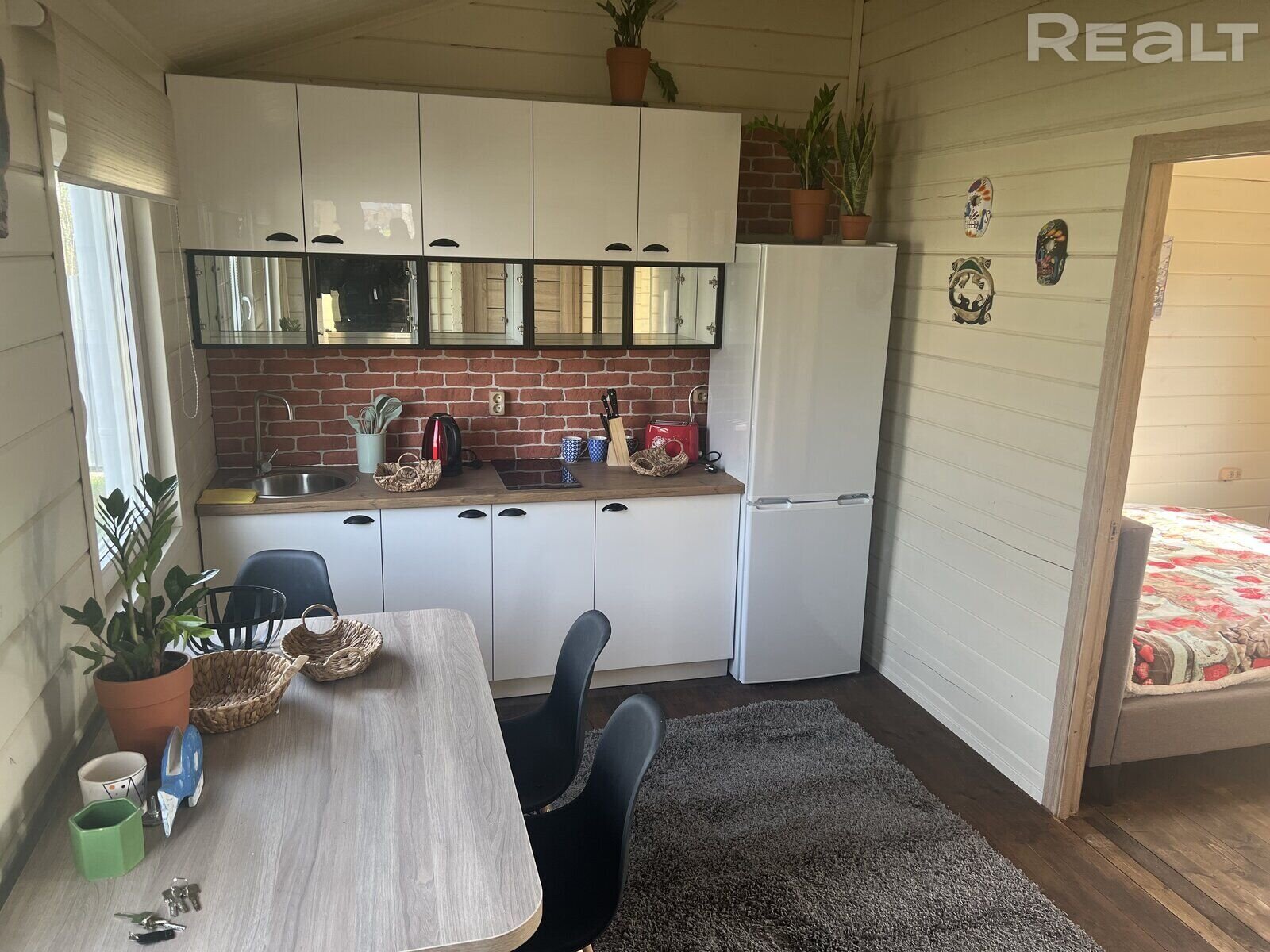 Внутри есть несколько обустроенных комнат. Все они отделаны деревом. Кухня совмещена со столовой зоной и занимает 16 «квадратов». У одной стены стоит холодильник, висит кухонный гарнитур, есть умывальник и небольшая электроплита.