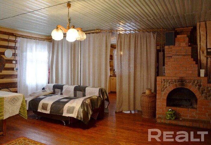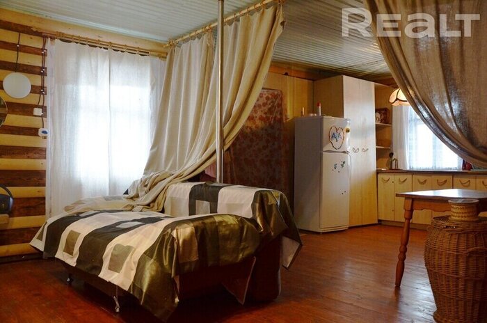 Дом занимает 62 квадратных метра. Внутри все отделано деревом. Помещение удалось зонировать с помощью штор. В комнате есть два отдельных спальных места и диван. Вся мебель и техника переходят вместе с ключами покупателю.