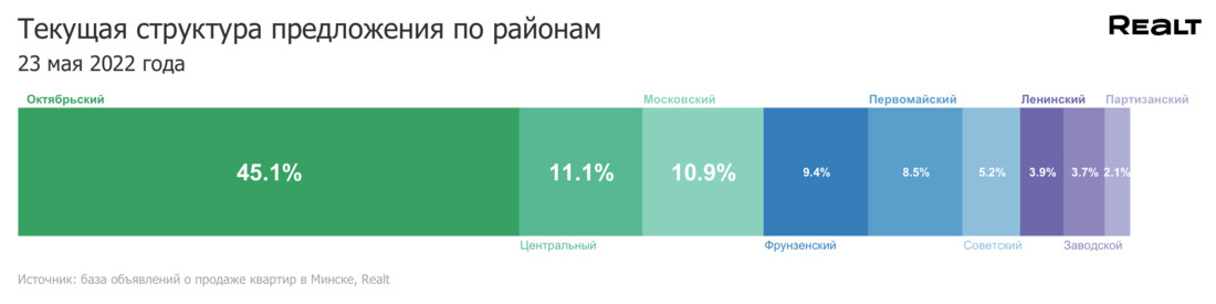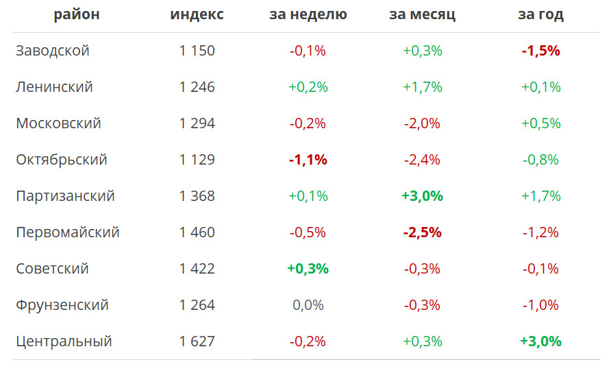 Среди районов города динамика цен была разнонаправленной. Наибольшее снижение отмечалось в Октябрьском (-1,1%) и Первомайском (-0,5%) районах. Рост — в Советском (+0,3%) и Ленинском (+0,2%).