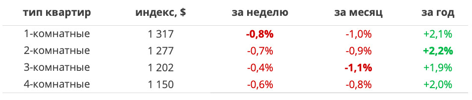 Индекс цен на квартиры в Минске за семь дней снизился на 0,6% и составил 1254 $. Представленный индекс цен на вторичном рынке сильно подвержен влиянию большого числа объявлений о продаже квартир в отдельных новостройках (не весь первичный рынок). Средняя цена квадратного метра без учета такого влияния сейчас равна 1312 $, что на 0,1%. меньше, чем неделей ранее.