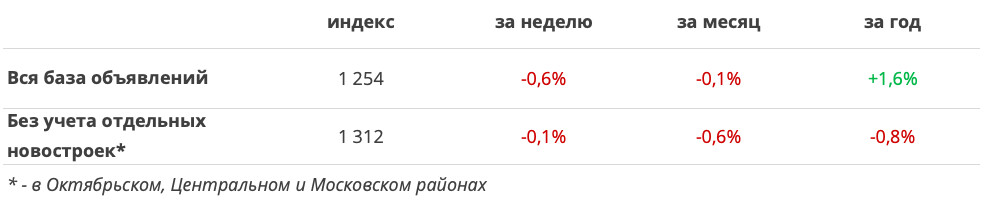 Все представленные ниже данные рассчитаны на основе всей базы объявлений (с учетом объявлений о продаже квартир в отдельных новостройках в Октябрьском, Центральном и Московском районах).