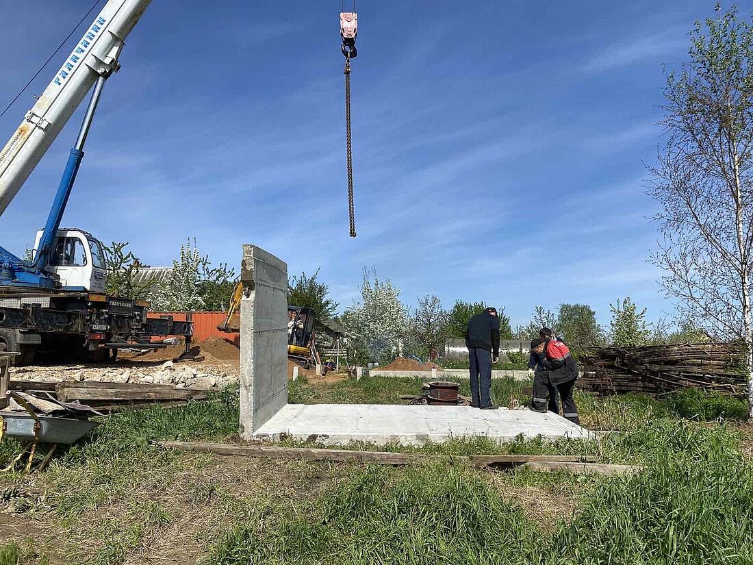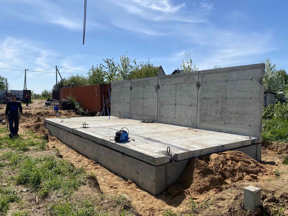 Далее на участок привезли L-образные модули. С помощью крана их прямо с машины установили на фундамент, закрепили между собой. В итоге получили основу — бетонные полы шириной 4,2 м и стенку высотой 2,4 метра.