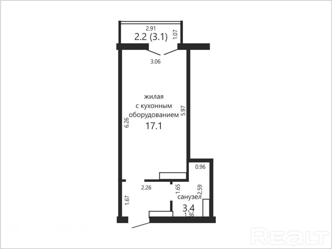 Лоджия застекленная и занимает 3,2 «квадрата».