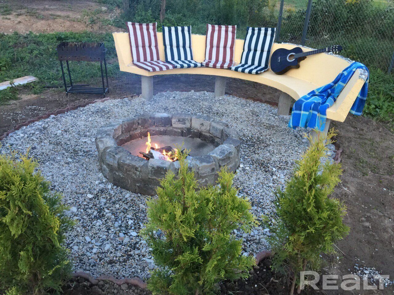 Просторная веранда построена со стороны двора, оттуда открывается вид на поле. На 10 сотках также стоит кирпичный домик для бани и кострище из натурального камня с морской галькой. На участке растут различные цветы, кусты и туи.